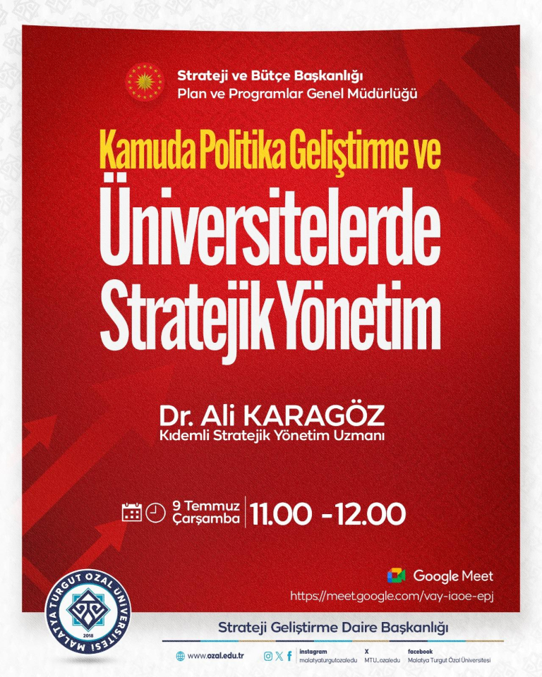 Üniversitemizin 2027–2031 dönemi Stratejik Planı hazırlık süreci kapsamında, Stratejik Planlama Çalışma Gruplarının çalışmalarını daha verimli ve amaca uygun şekilde yürütebilmelerini desteklemek amacıyla, 9 Temmuz 2025 Çarşamba günü saat 11.00’de Cumhurbaşkanlığı Strateji ve Bütçe Başkanlığı’ndan Kıdemli Stratejik Yönetim Uzmanı Dr. Ali ...